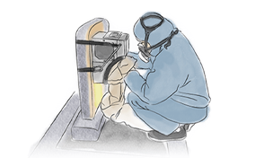 特殊な砂を、高圧圧縮空気と一緒に吹き付け